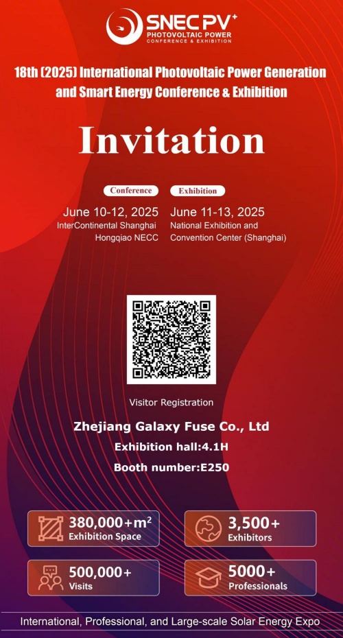 Schlüsselwörter:SNEC PV+, Photovoltaikausstellung, neue Energieausstellung, Shanghai Solarausstellung, Ausstellung Vorschau, Standinformationen,Zhejiang Galaxy Fuse Co. Ltd..,Sicherung, PV -Sicherung, Smart Energy, Ausstellungseinladung, 2025 Ausstellung, Shanghai Ausstellung.